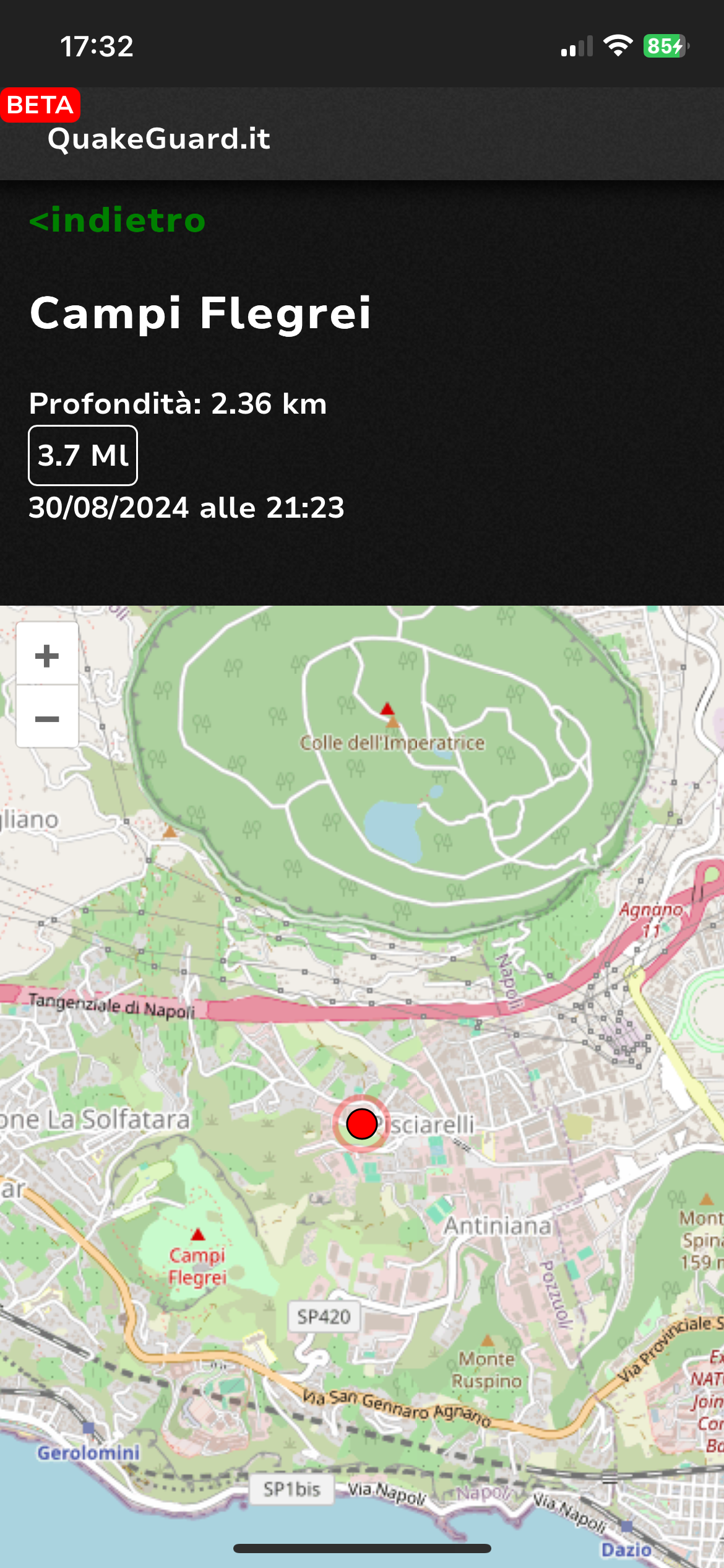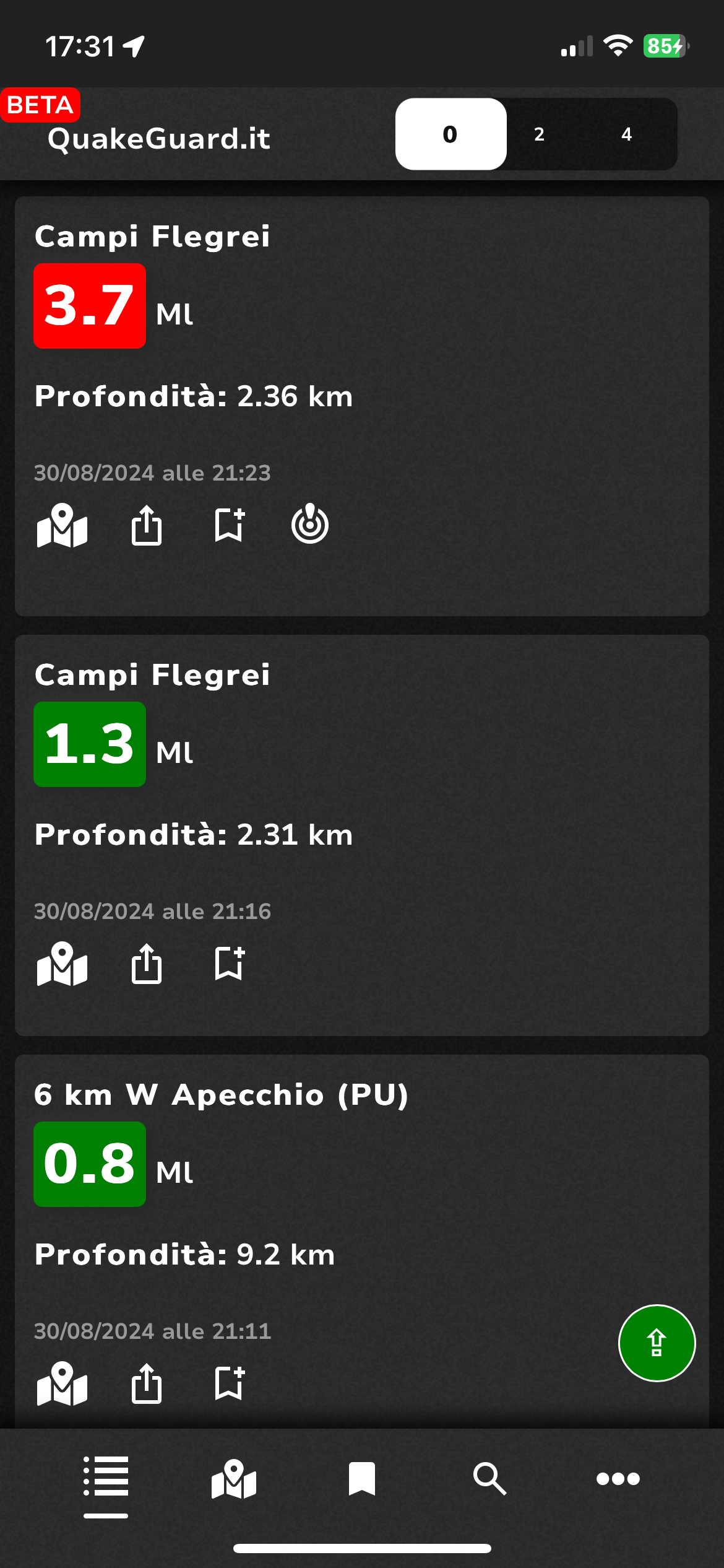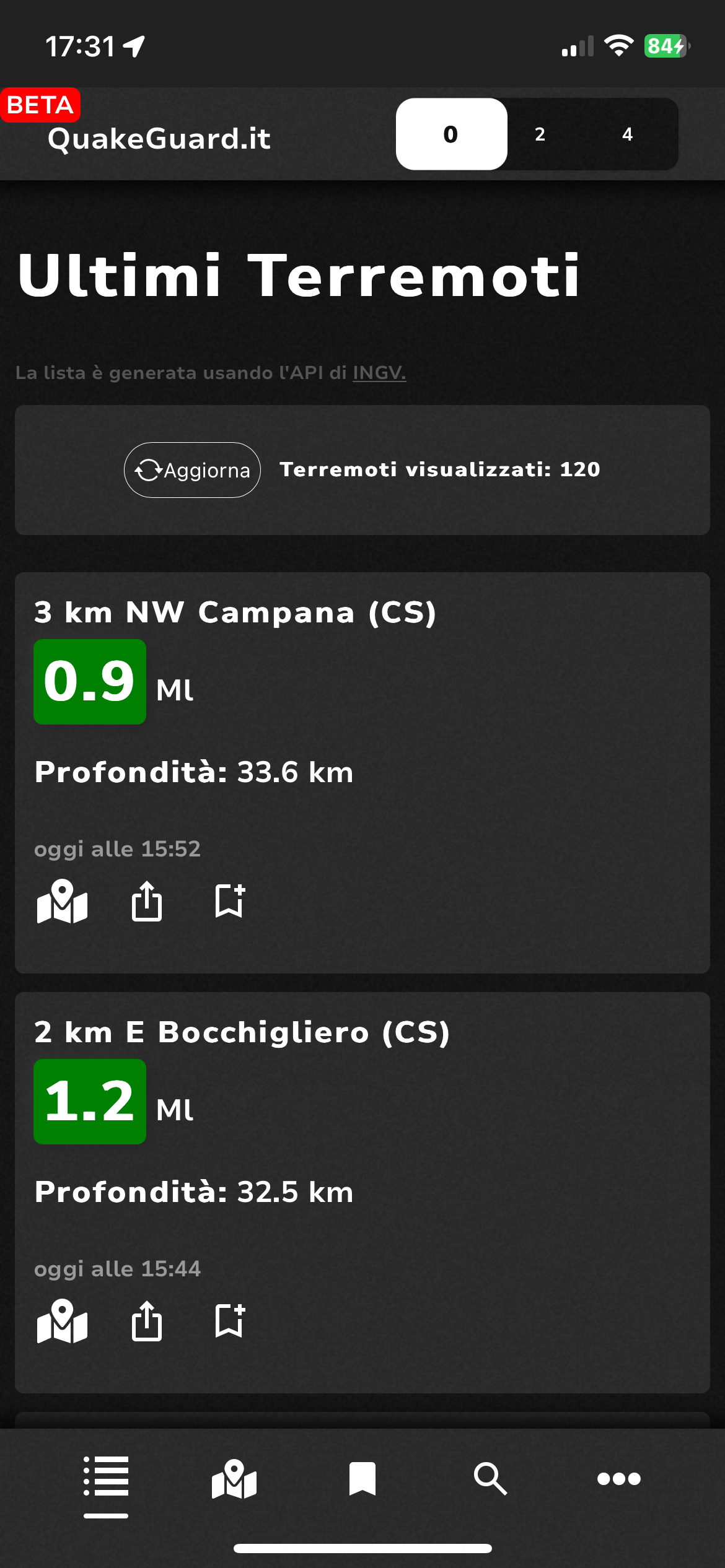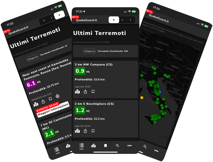 La lista di terremoti è sempre aggiornata tramite l'API di INGV.